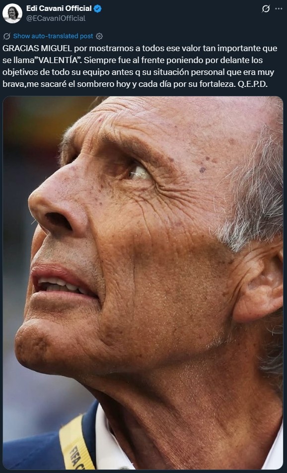 卡瓦尼写谈:“感谢你米格尔,你向咱们系数东谈主展示了名为‘勇气’的贵重品性。你老是冲锋在前,将全队的狡计置于个东谈主窘境之上,尽管你正资格着无比劳苦的本事。今天乃至过去的每一天,我皆将为你展现的力量脱帽问候,愿你安息。”