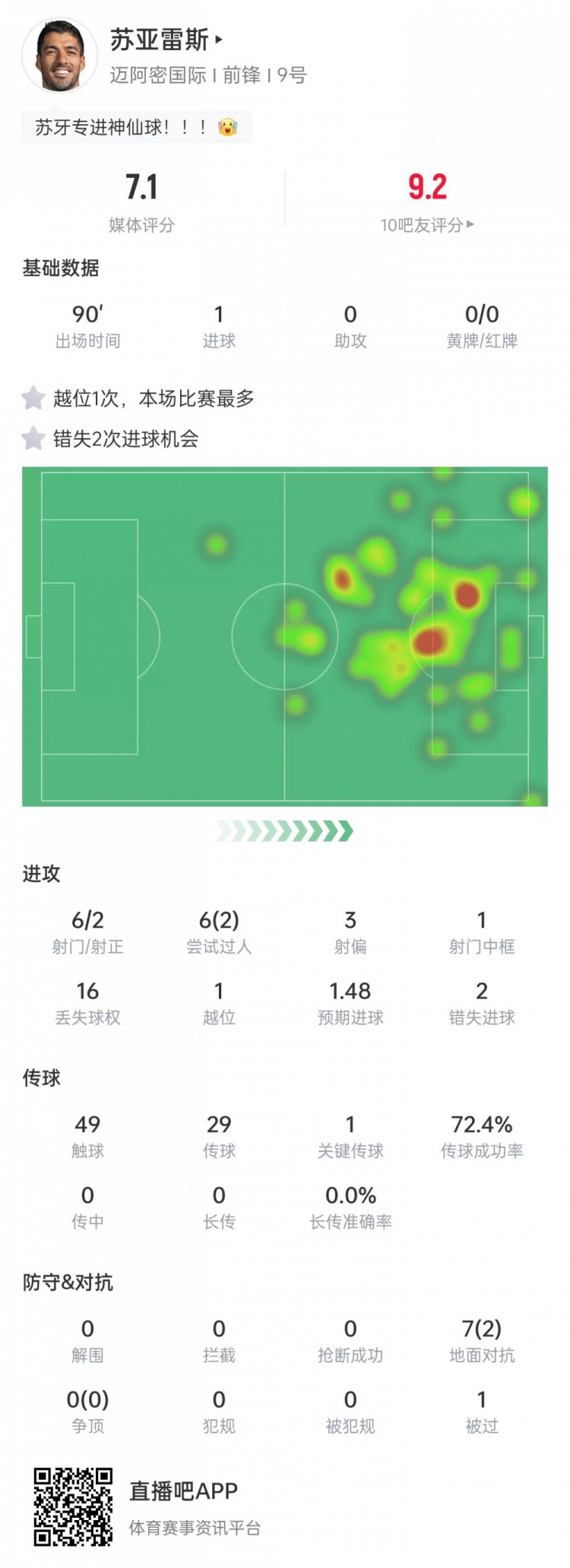 生计第600球!苏牙数据:6次射门2次射正,错失2次契机,评分7.1