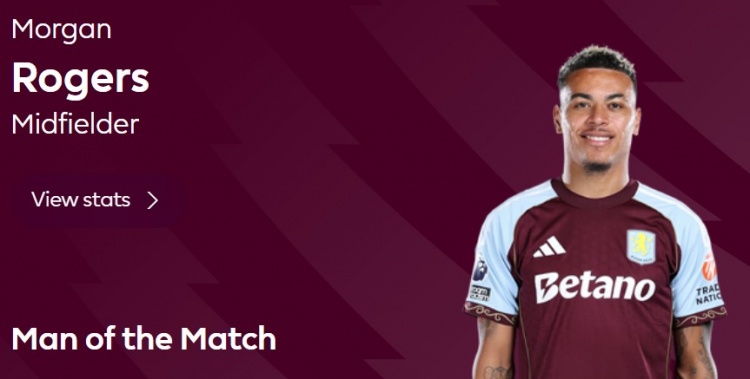 本场比赛上半场维拉球员罗杰斯打进远射宇宙波,赛后他也当选英超官方球迷票选全场最好球员。