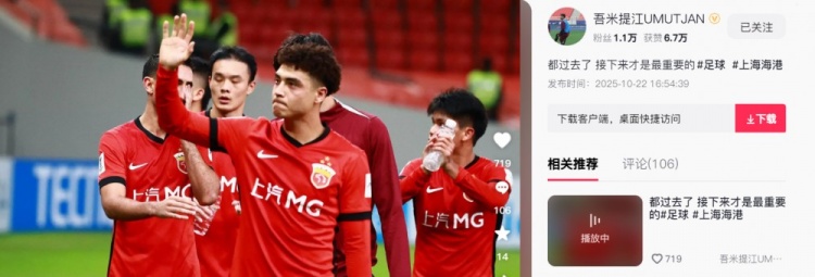 10月22日讯 亚冠精英联赛第三轮,上海海港主场0-2不敌町田泽维亚。赛后,海港球员吾米提江更新了个东谈主应付媒体。
