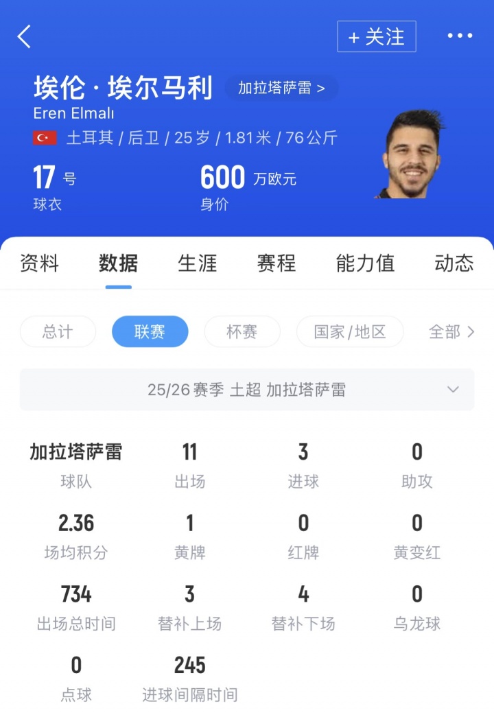 埃尔马利现年25岁,司职左后卫,身价600万欧,已代表土耳其国度队出场过20次。在9月、10月的海外比赛日历间,土耳其4场比赛中他三次首发出战。