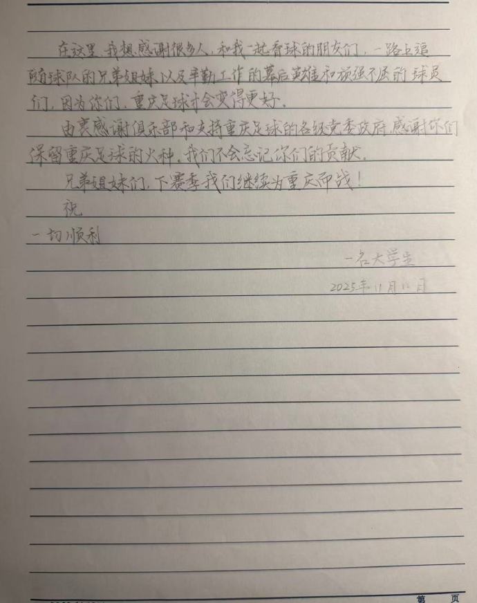 11月11日讯 重庆铜梁龙俱乐部官方社媒晒出了球迷的来信,并向这些给球队来信的球迷抒发了感谢。