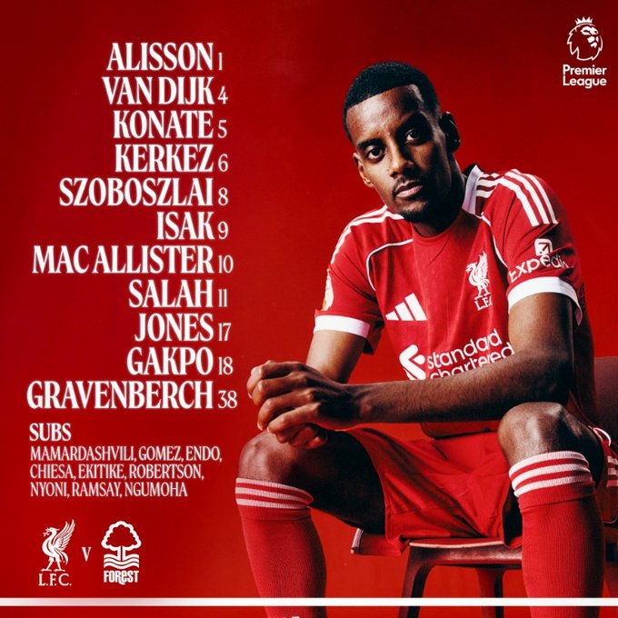 利物浦vs丛林首发:伊萨克+麦8赫先发,维尔茨伤缺,阿利松复出