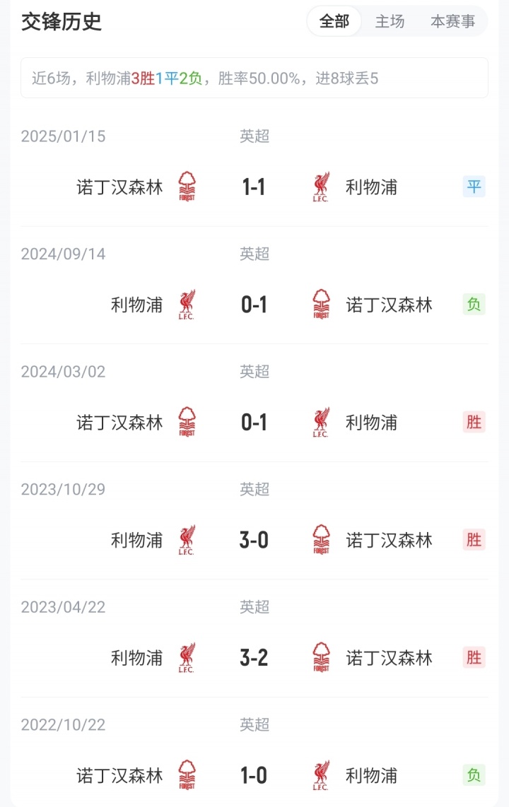 现在英超积分榜上,利物浦6胜5负积18分,位列第8;诺丁汉丛林2胜3平6负积9分,位列第19。