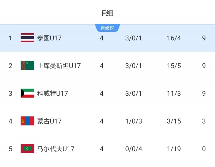 预选赛适度,泰国U16、土库曼斯坦U16和科威特U16同积9分,泰国U16最终凭借净胜球的上风晋级。