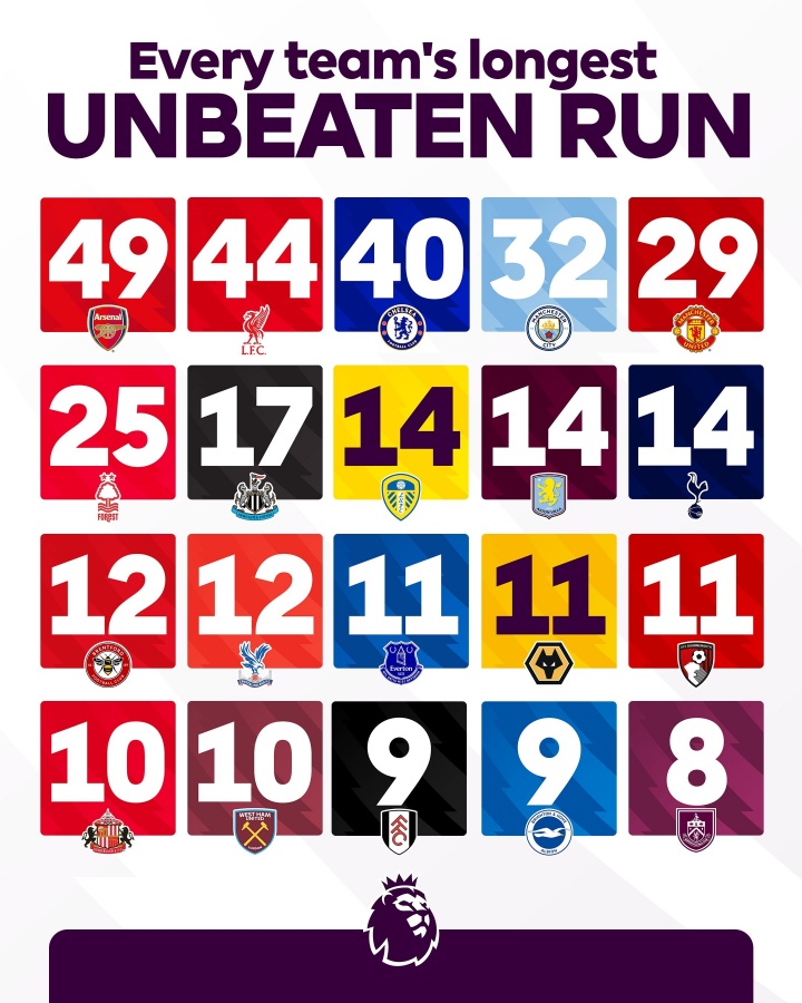 英超官方清点了联赛中每支球队当今的最长不败记载,并提问:“你以为阿森纳的记载会有被遏止的那一天吗?”