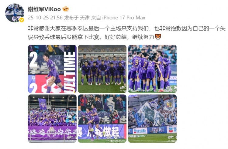 10月25日讯 中超联赛第28轮,天津津门虎主场2-2绝平长春亚泰。赛后,为津门虎完成绝平的谢维军更新了个东谈主酬酢媒体。