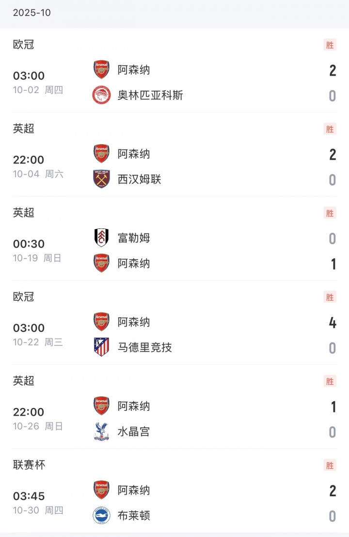 10月30日讯 阿森纳刚刚渡过了无缺的10月,球队在在英超、欧冠、联赛杯赛场6战全胜,打入12球,一球未丢。