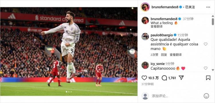 10月20日讯 本轮英超焦点战,曼联2-1客得胜物浦。赛后,曼联队长B费更新社媒庆祝得胜。
