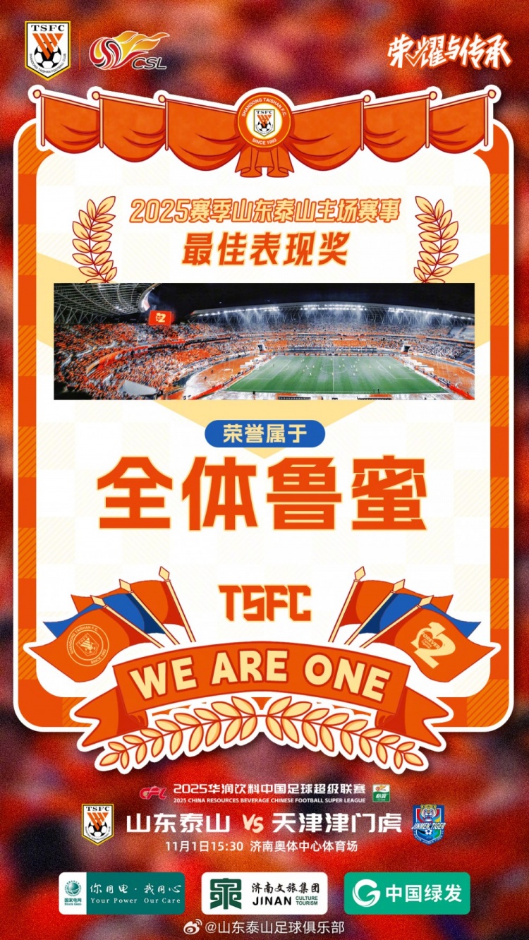 在本赛季主场收官战前,山东泰山俱乐部官方发布海报,将本赛季山东泰山主场赛事最好推崇奖给以整体鲁蜜。