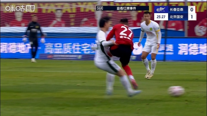 11月01日讯 中超第29轮 长春亚泰vs北京国安。比赛第26分钟,亚泰外助卡米洛踹中江体裁群众腹部,VAR介入认定非红牌。主裁判给了卡米洛黄牌。