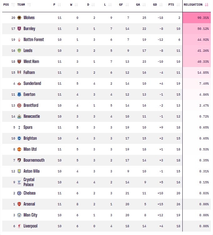 11轮仅两分,OPTA超等估量机展望:狼队左迁概率高达90.31%