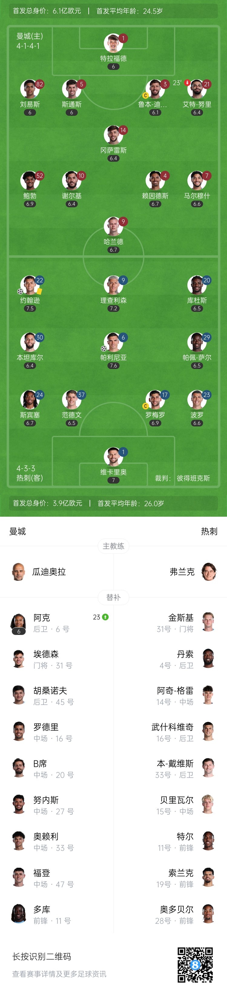 第35分钟,理查利森右路接球杀到禁区边,横传禁区内,布伦南-约翰逊包抄破门!边裁暗意越位,但VAR改判进球灵验!热刺1-0率先曼城↓