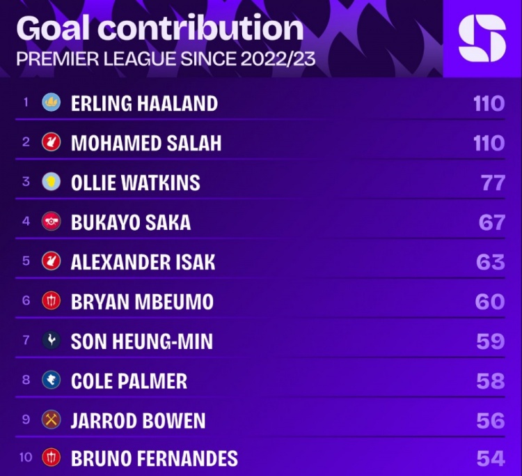 据Squawka的数据统计,自哈兰德加盟曼城以来,他照旧在英超联赛径直参与110粒进球,同时莫得哪名球员比他更多,只消萨拉赫相同参与110粒进球与他握平。