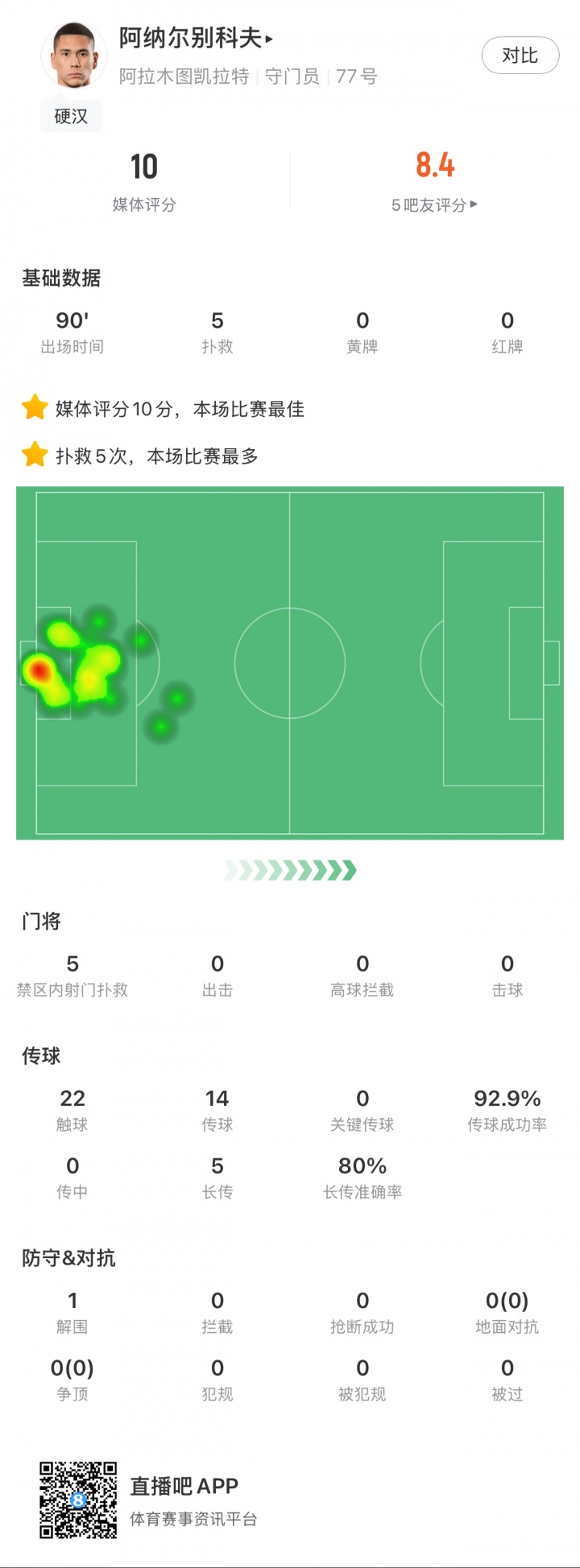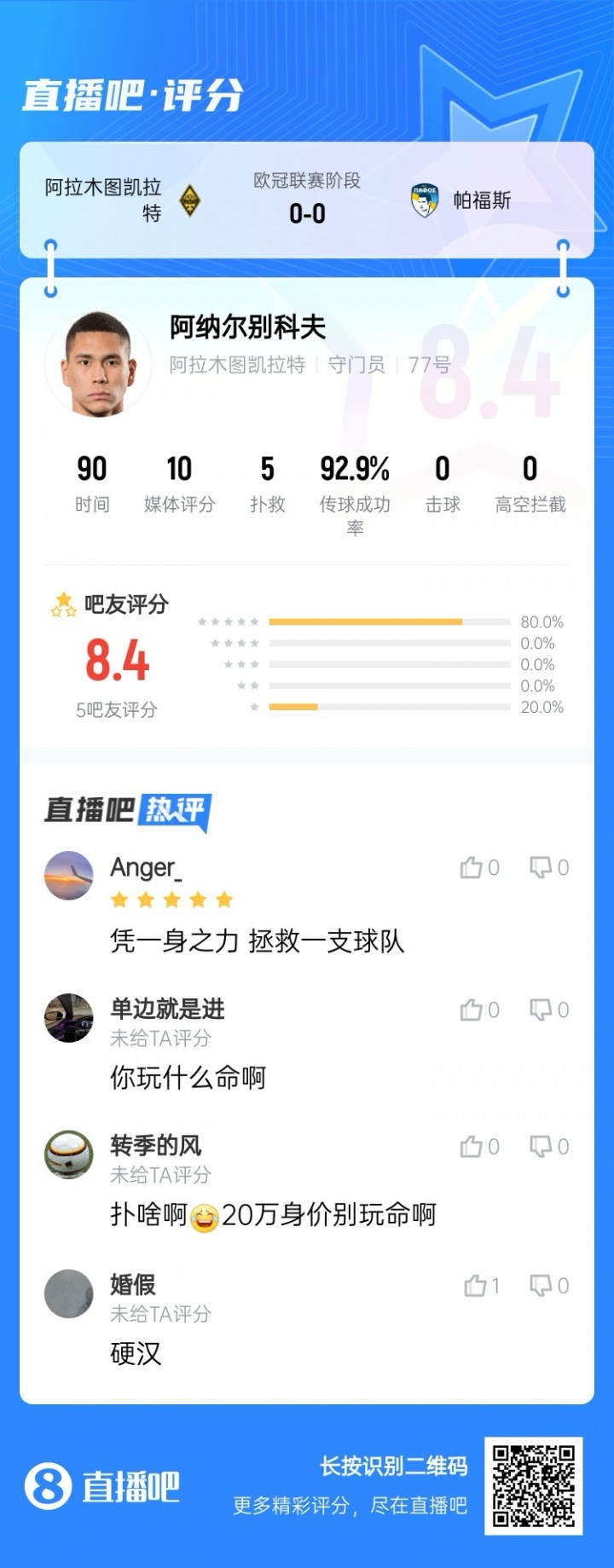 10月22日讯 欧冠联赛阶段第3轮,阿拉木图凯拉特主场0-0战平十东谈主帕福斯,主队的哈萨克斯坦门将阿纳尔别科夫5次扑救获评10分满分!