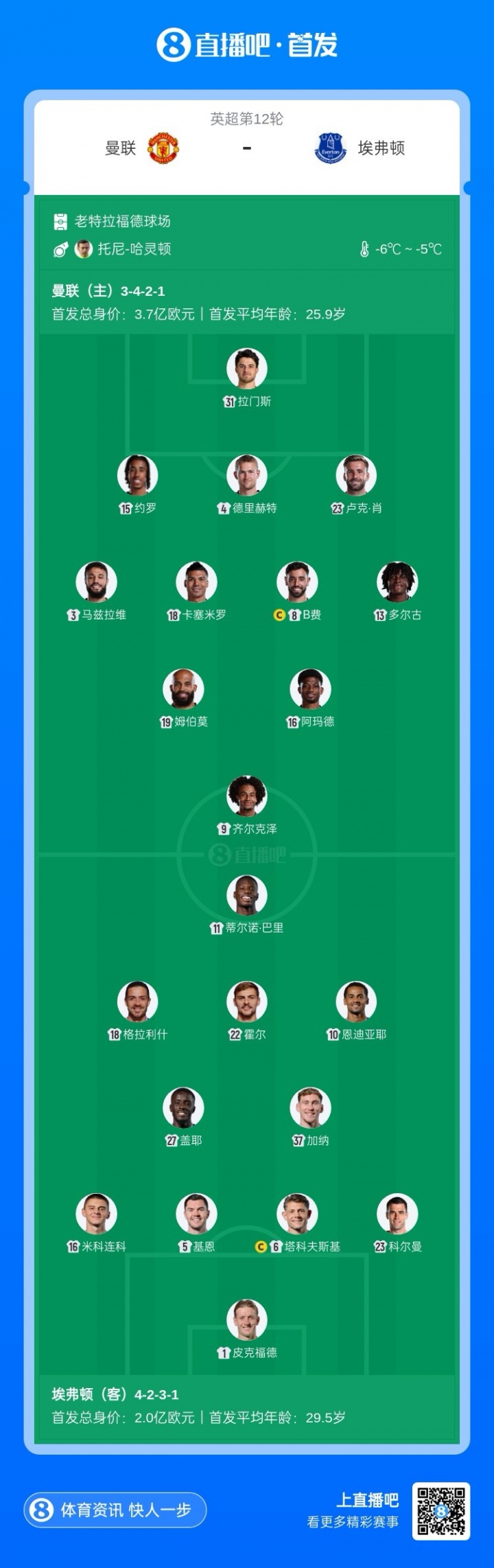 曼联vs埃弗顿首发:皆尔克泽、阿玛德先发,库尼亚缺阵利马讲究