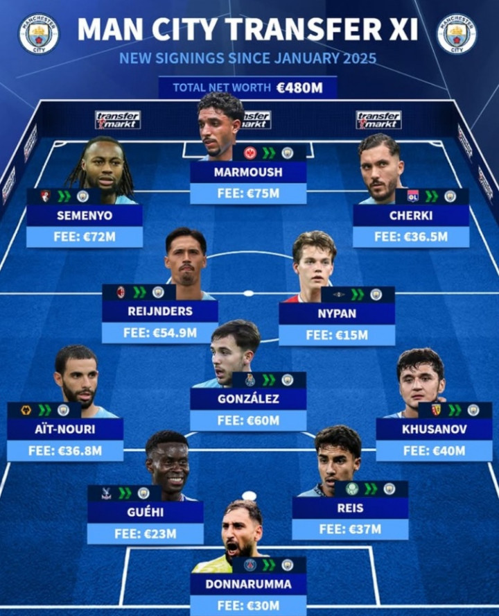 曼城自2025年1月以来引援威望:总耗资4.8亿欧元