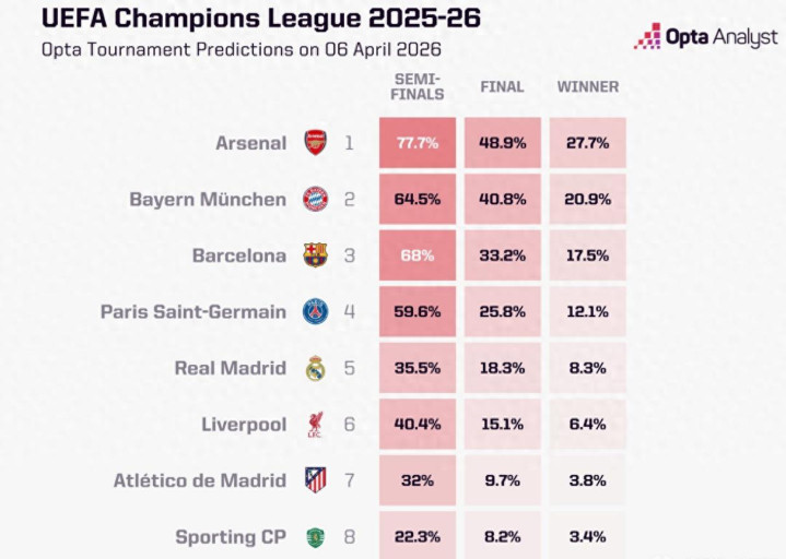 OPTA的夺魁 概率更新,不只是晋级下一轮 概率。从整个八强到最终捧杯,超级计算机同样给出了模拟结果。阿森纳是最大热门,拜仁紧随其后,巴萨和巴黎分列三四。皇马因为要跨过拜仁这道坎,夺魁 概率被调低了不少。利物浦更惨,他们不仅要过巴黎这一关,准总决赛 还可能碰上皇马或者拜仁。