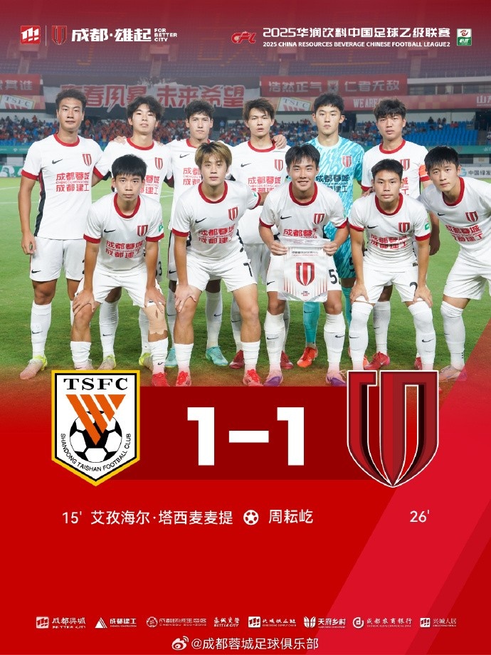 今晚,2025华润饮料中乙联赛决赛阶段首轮比赛,成皆蓉城B队客场挑战山东泰山B队,休整了近20天的蓉城后生军们展现出腾贵的热切斗志。上半场,敌手领先获取进球,周耘屹随后破门扳平比分,半场比分1-1。下半场两队均未能获取进球。最终,成皆蓉城B队1-1战平山东泰山B队。