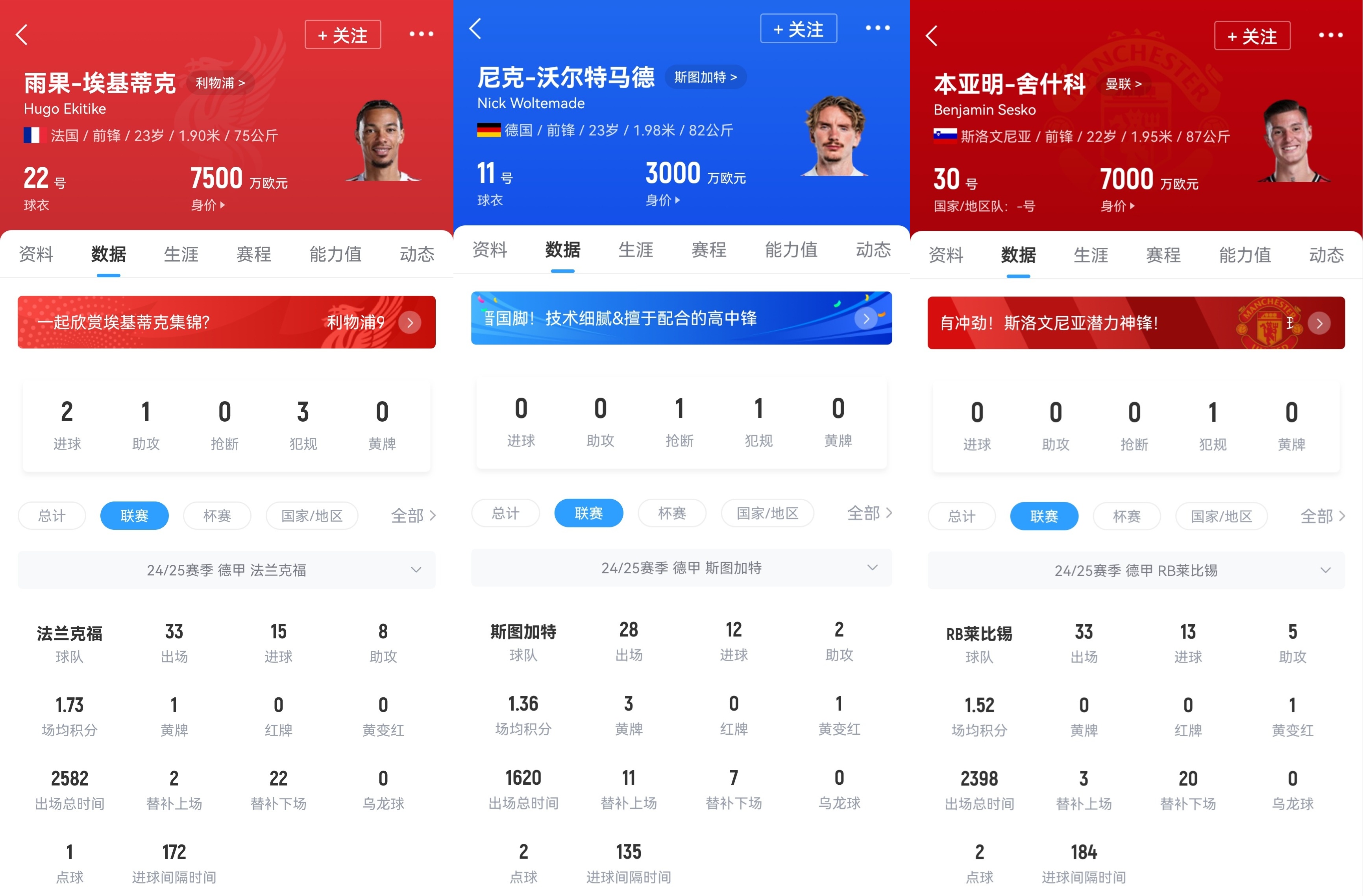 埃基蒂克 德甲33场15球8助 转会费8000万固定+1500万浮动(1000万容易收尾)