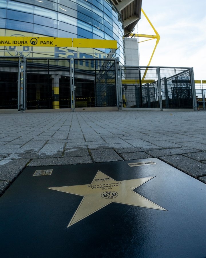这块镶有金色星星、刻着“马茨-胡梅尔斯”及“2014年寰宇冠军”字样的玄色石板,已被镶嵌北看台前广场的大地。