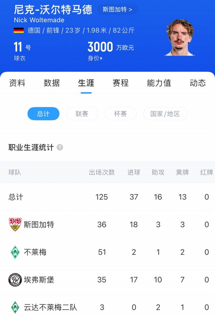 沃尔特马德现年23岁,德国时尚,与斯图加特现存左券在2028年到期,现德转估值为3000万欧。上赛季,沃尔特马德为斯图加越过战33场,打进17球并得到3次助攻。