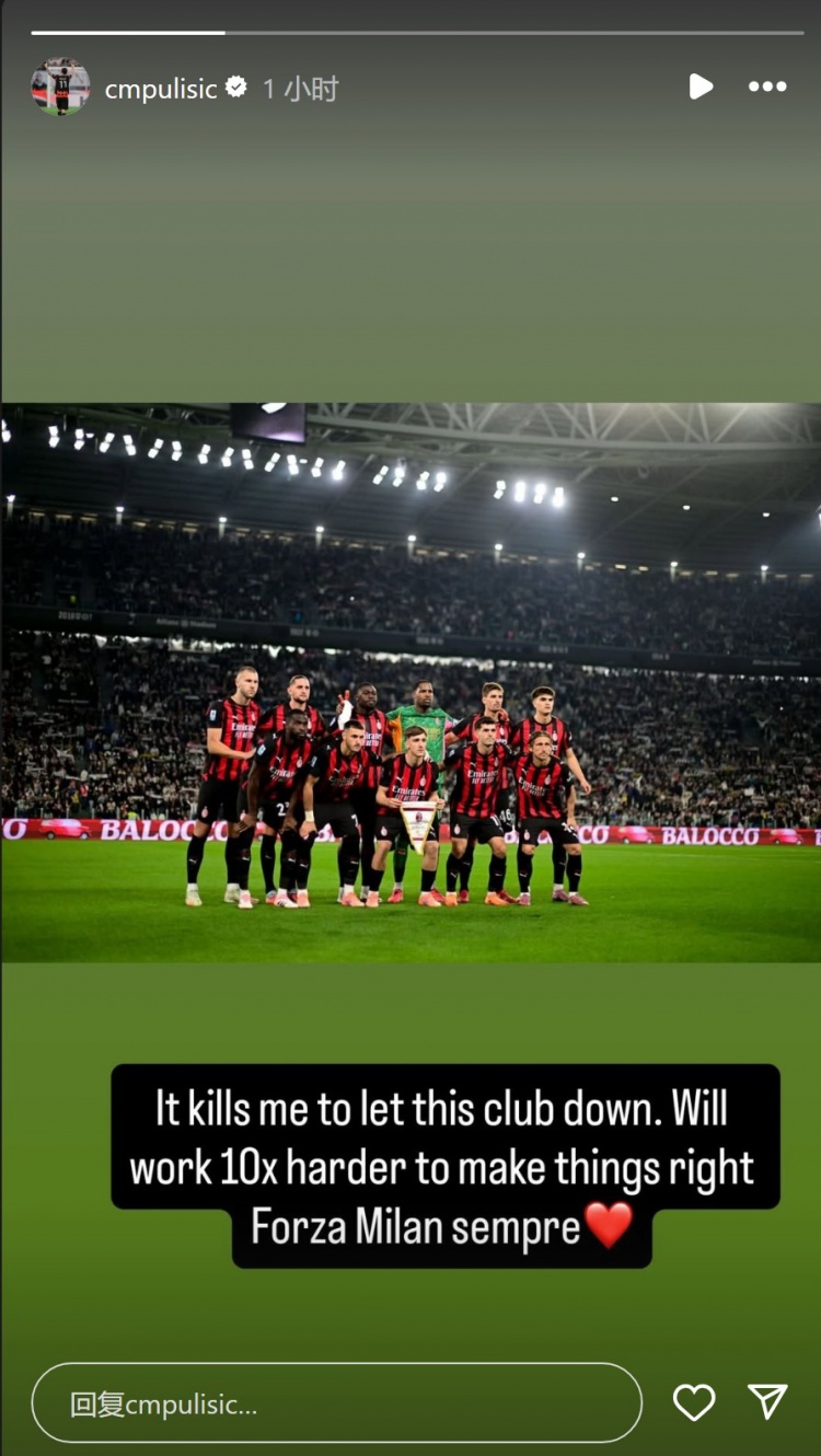 普利西奇社媒晒出首发球员赛前的合照,并写谈:“让俱乐部失望令我痛彻情怀,我会付出十倍勤奋来弥补一切,米兰永恒加油!”