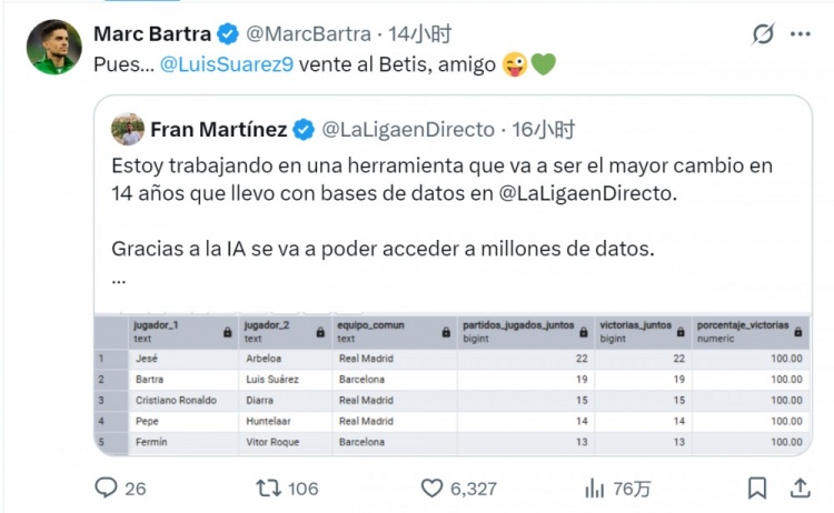 现在效用于贝蒂斯的巴尔特拉在应付媒体上转发了这条动态,配文嘲谑:“那么…苏亚雷斯,来贝蒂斯吧,哥们。”