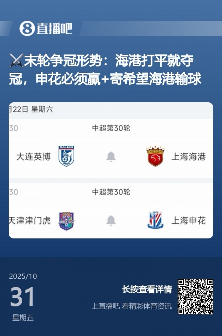 本赛季海港跳跃申花2分,末轮只需要打平就夺冠。