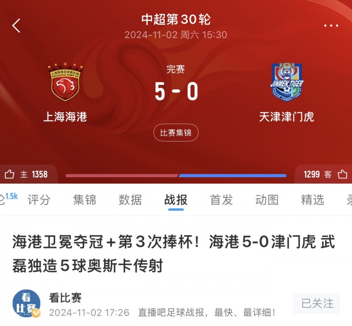 如出一辙!旧年第29轮海港跳跃申花1分,最终海港5-0津门虎夺冠