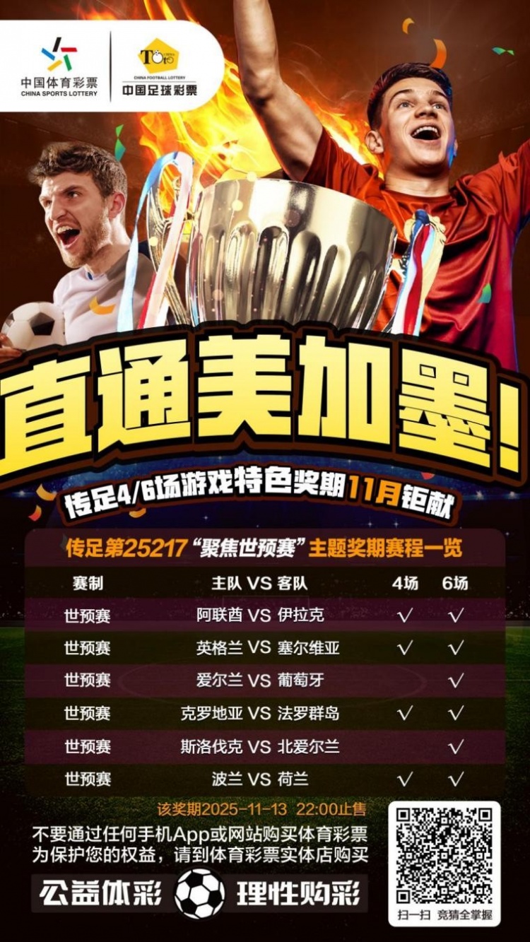 第25217期传足4/6场游戏特点奖期仍是于2025年11月9日20:00开售,将于2025年11月13日22:00停售,并于11月15日开奖,其中阿联酋VS伊拉克、英格兰VS塞尔维亚、克罗地亚VS法罗群岛和波兰VS荷兰为4场进球游戏竞猜赛事。