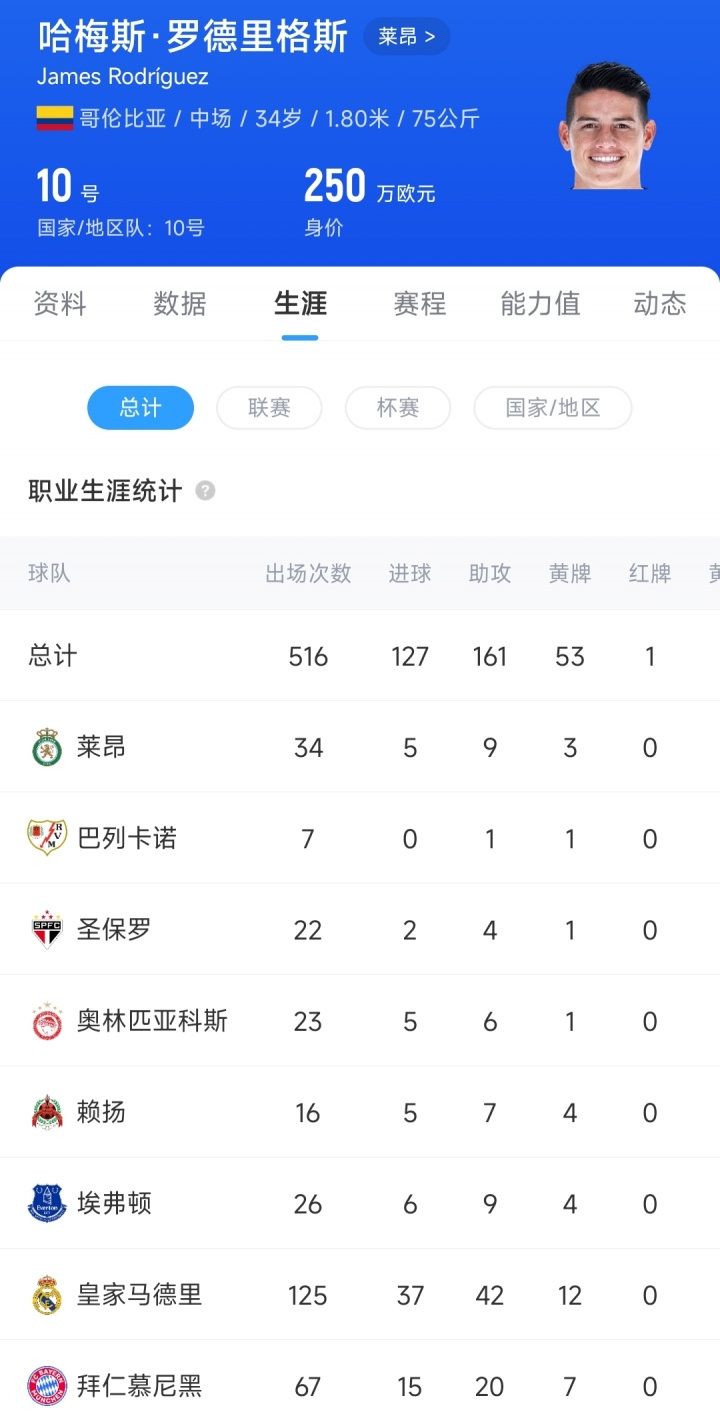 自2020年起,J罗如故曲折过皇马、埃弗顿、赖扬、奥林匹亚科斯、圣保罗、巴列卡诺、莱昂7支球队。加盟莱昂后J罗共出战34场比赛,孝敬5粒进球和9次助攻。现在34岁的J罗德回身价为250万欧元。