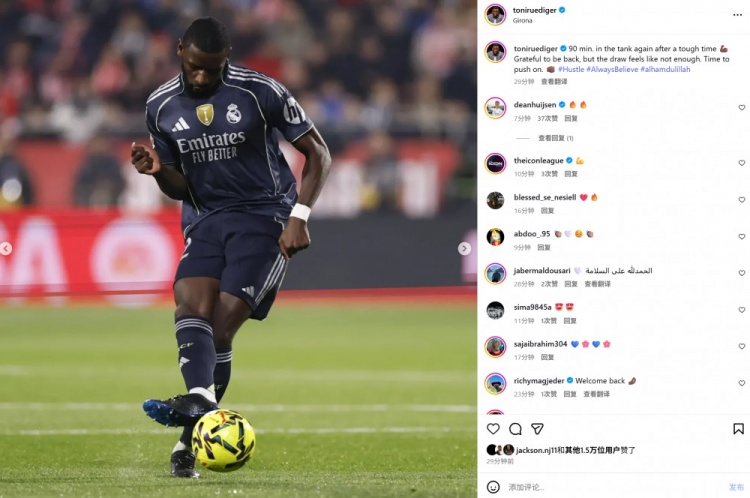 本场比赛吕迪格复出首发出场,他也在个东说念主社媒晒出本场相片,配文写说念:“在阅历了一段勤恳的期间后再次进行90分钟的高强度比赛💪🏾。很谢意大要回来,但平局的效果让东说念主嗅觉不够发放。是时辰不绝前进了。”