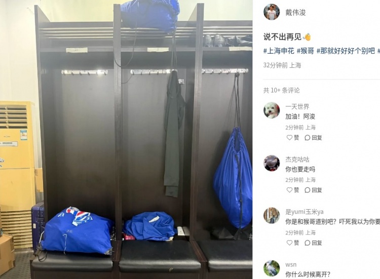 戴伟浚在社媒晒出了锻练截至后更衣室的相片,他在更衣室的座位正巧紧挨着于汉超的位置,看着于汉超打包好的衣物,因此他特别感叹地配文“说不出相遇”。