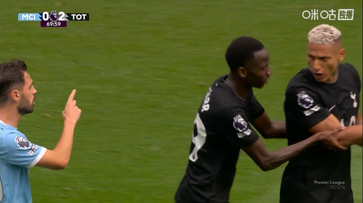 08月23日讯 英超第二轮,曼城镇守主场对阵热刺,比赛第70分钟,理查利森与曼城球员发生争握,被队友拉住后仍喋喋不断。随后主裁向尼科与理查利森各出一张黄牌